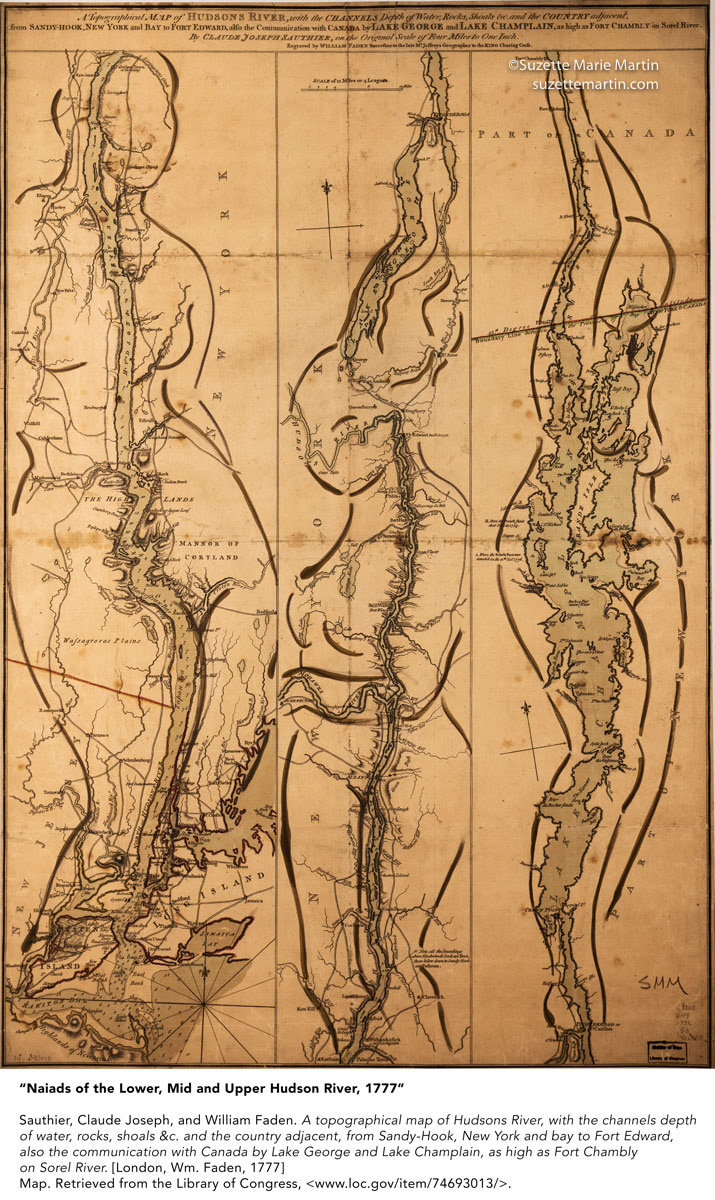 Classically educated Europeans who mapped the New World would have been familiar with river nymphs from ancient Greek mythology. The bodies of these Naiads passively occupy waterways renamed during the colonization of North America, marking silent passage from millennia of “uncharted territory” to the eradication of indigenous cultures, and extensive environmental changes, that began during European exploration and settlement.